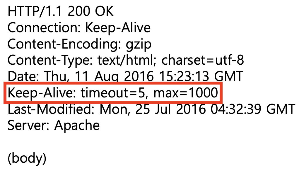 위 사진은 HTTP/1.1의 헤더의 모습이며, TCP 연결 재사용을 위해 헤더에서는 Keep-Alive 필드로 표시한다.