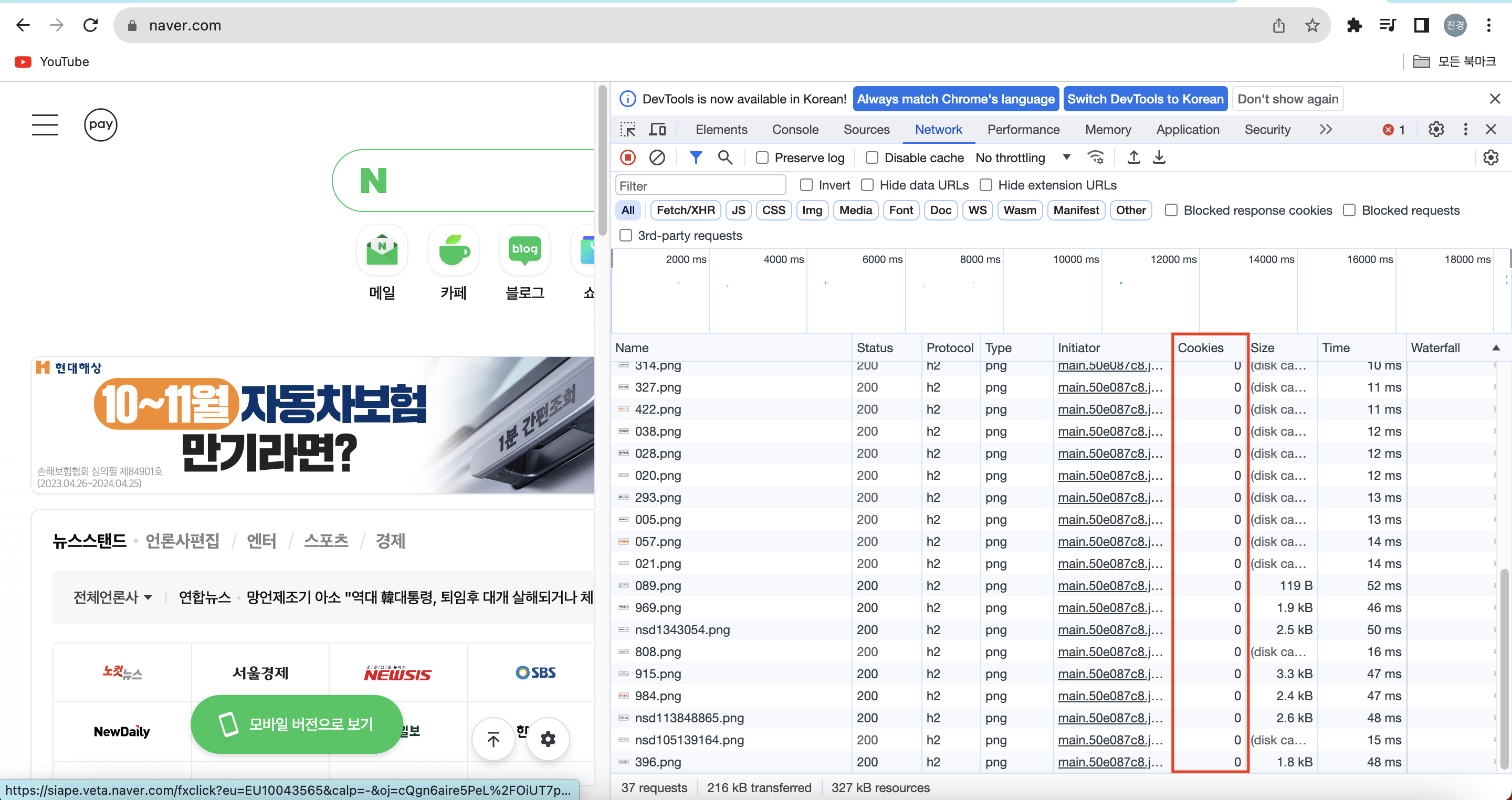 크롬에서 개발자 도구를 통해 쿠키를 확인할 수 있다.