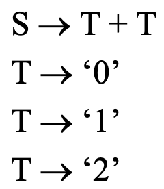 위 사진에서 T를 T -> '0' | '1' | '2' (엄밀히 규칙이 3개이다.)로 만들 수 있다.이때 S -> T + T에서 +는 terminal symbol이라고 해석할 줄 알아야 한다.