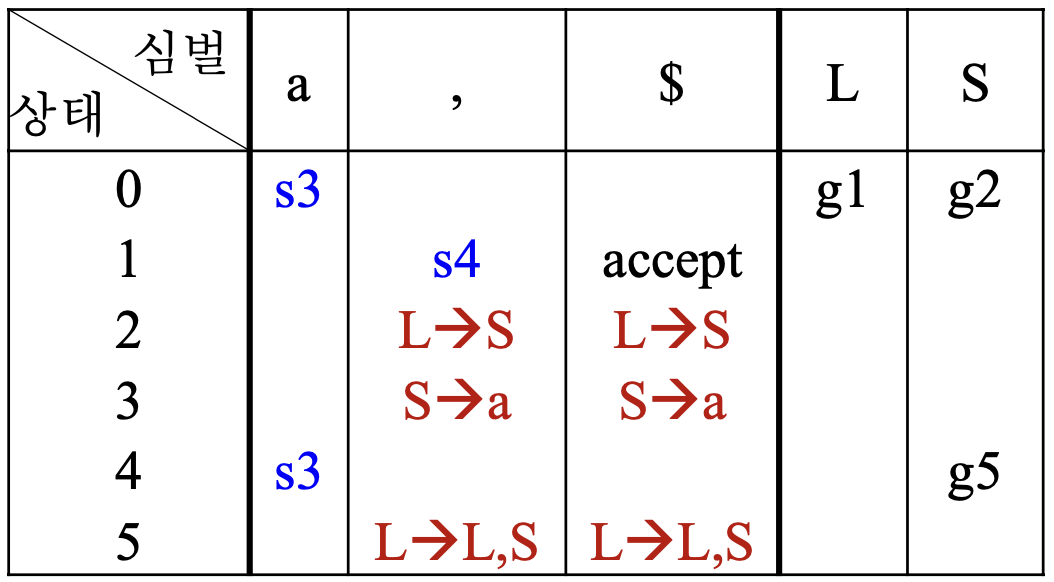 위 파싱 테이블을 통해 현재 상태 S와 입력 상태 a를 보고 다음과 같은 행동을 취할 수 있다.