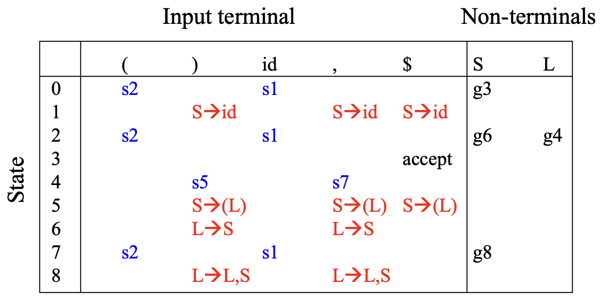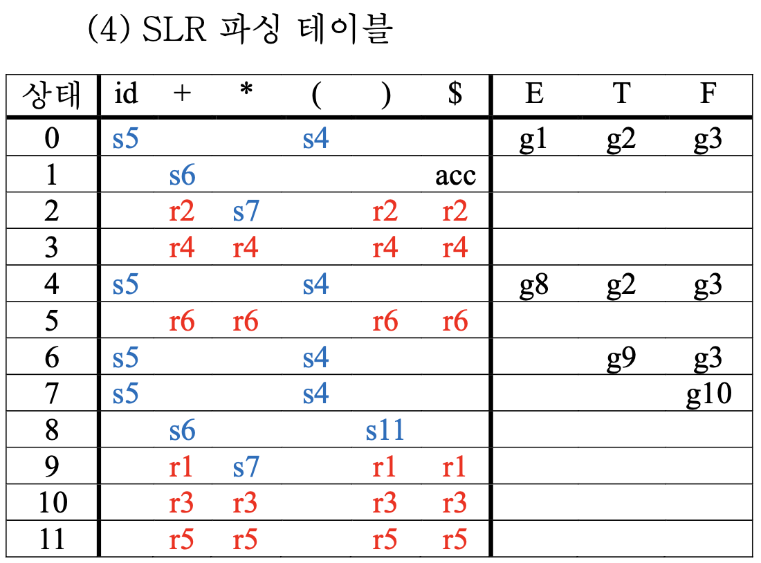해당 생성 규칙을 바탕으로 SLR 파싱 테이블을 만들면 아래와 같다.