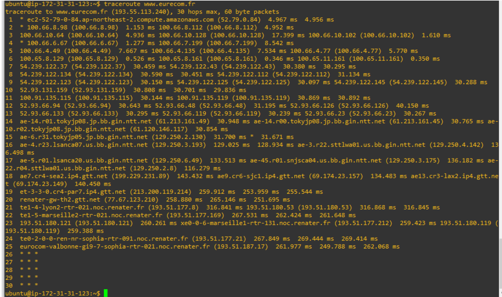 아래는 traceroute을 통해 AWS EC2에서 http://www.eurecom.fr까지의 지연시간이다.