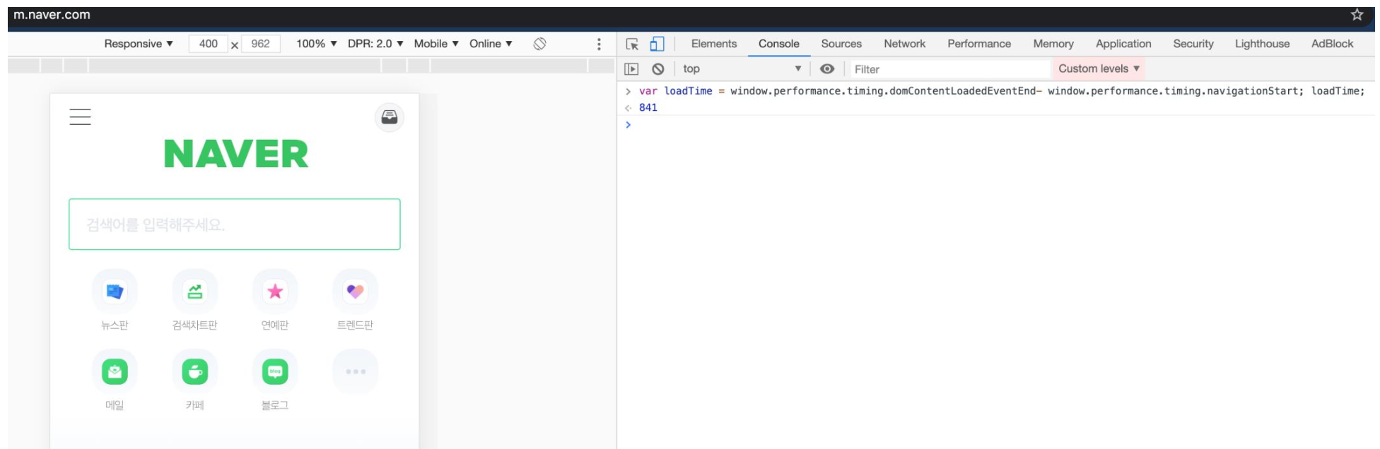 명령어를 입력하면 페이지의 PLT(Page Load Time)을 확인할 수 있다.