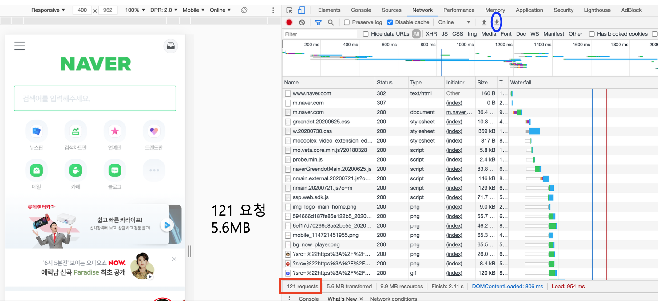 크롬의 개발자 도구 창의 붉은 박스 안의 내용을 통해 객체를 요청한 개수를 확인할 수 있다.
