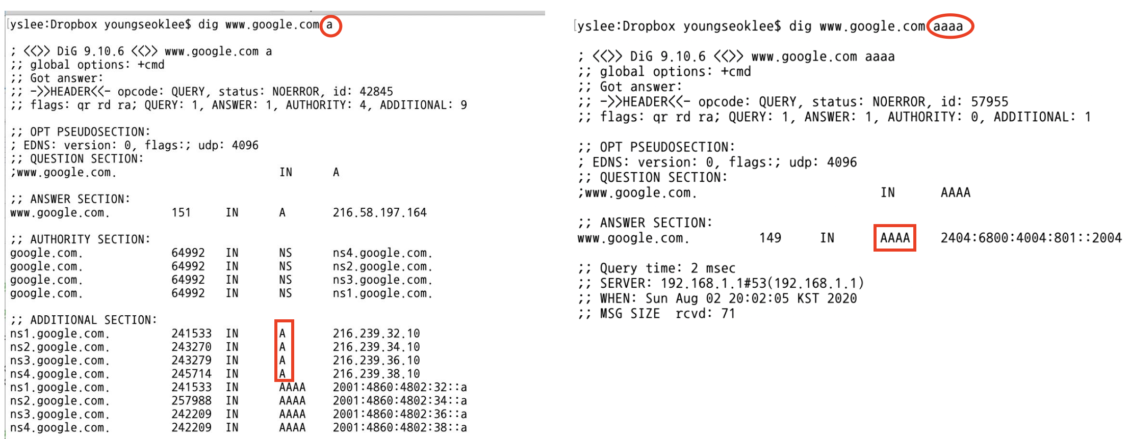 A의 경우 IPv4, AAAA의 경우 IPv6을 통해 표현한 것을 확인할 수 있다.