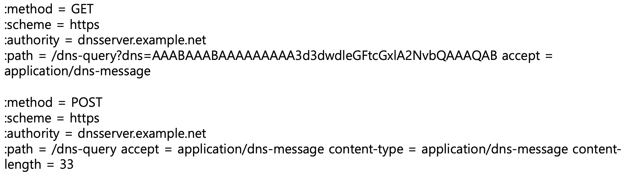 HTTP/2와 HTTPS를 사용하며 MIME Type은 application/dns-message이다.