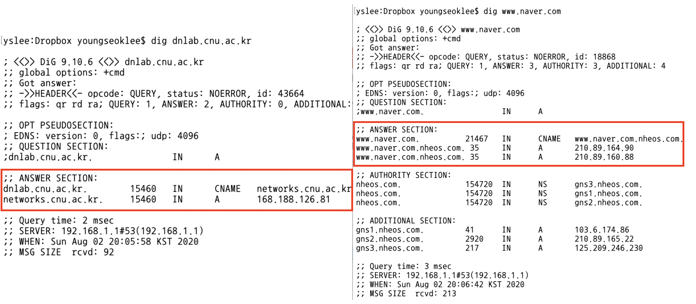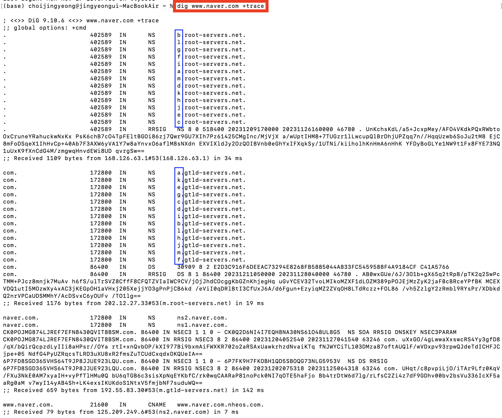 위 사진은 dig 명령어와 +trace를 통해 www.naver.com의 DNS를 확인해본 것이다.