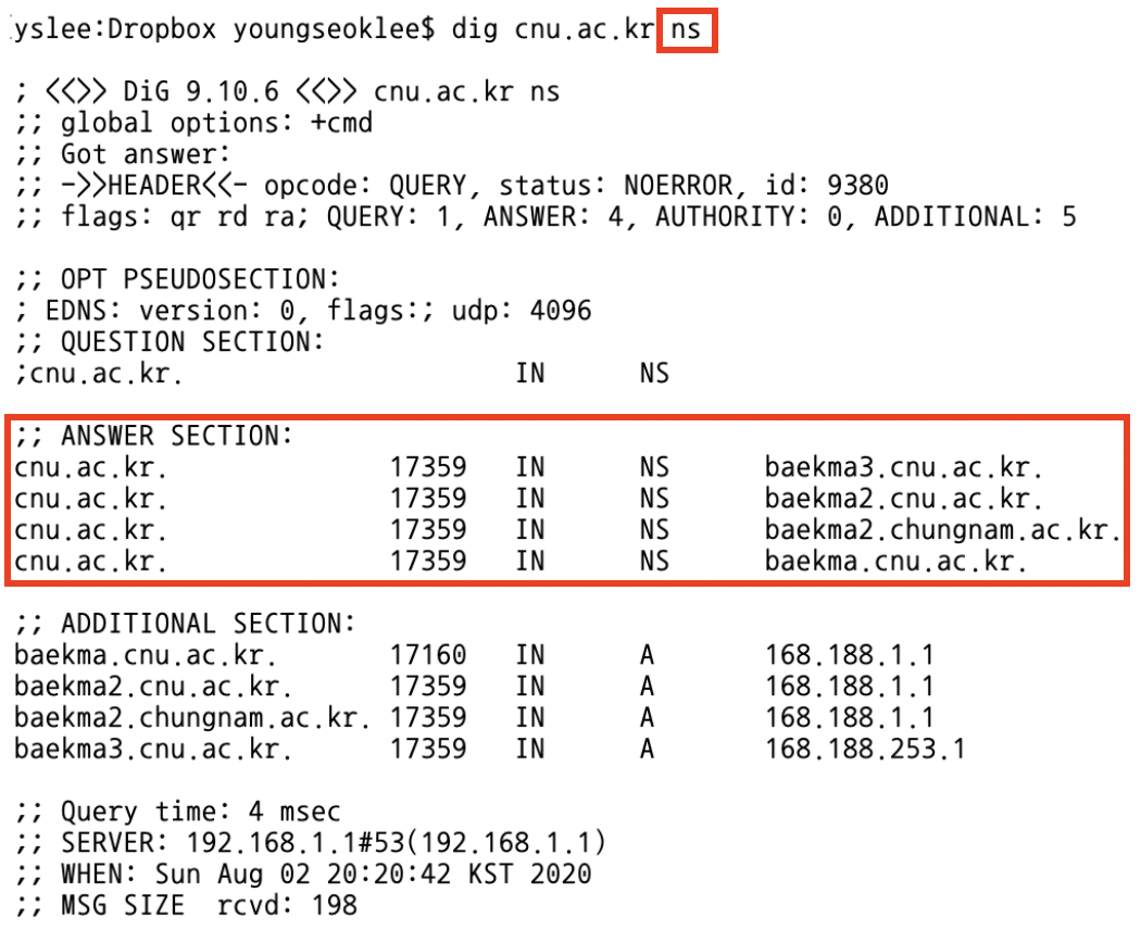 dig 명령어를 통해 네임 서버로부터 정보를 받아 확인할 수 있고,