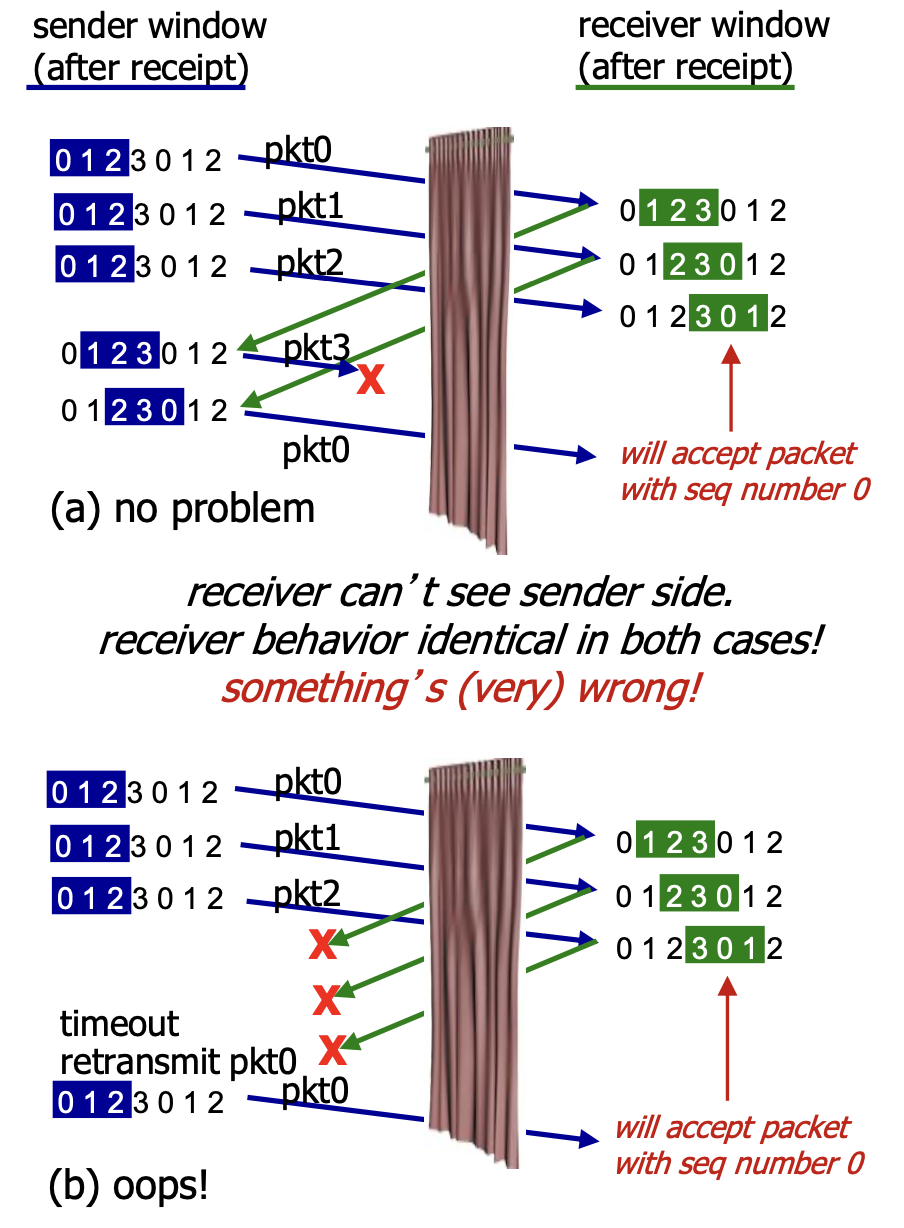 송신자 측은 0번 패킷을 재전송할 것인데, 수신자는 이미 윈도우를 슬라이딩하여