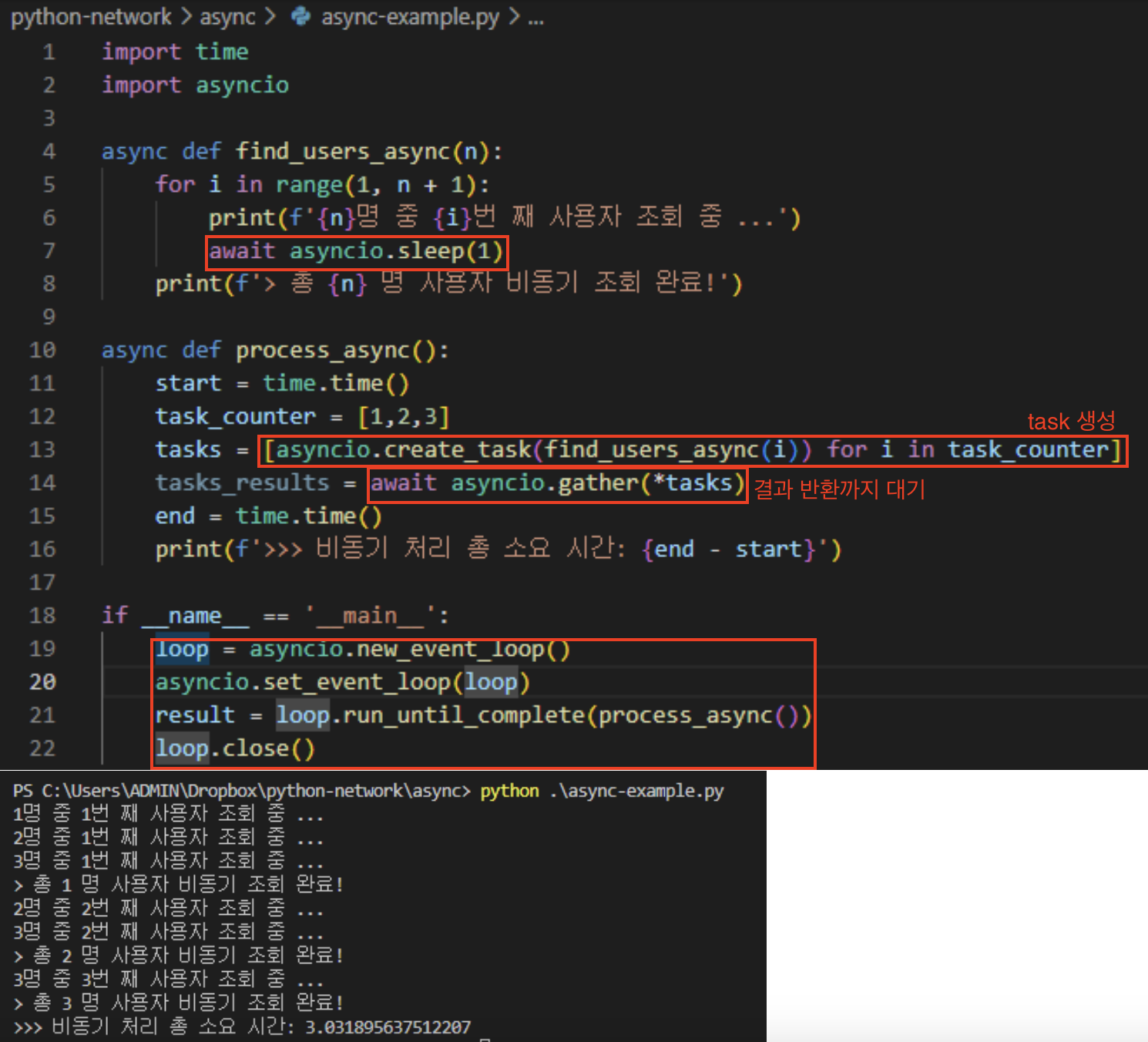 • asyncio.ensure_future(): 태스크 객체 생성 후 리스트로 만들기