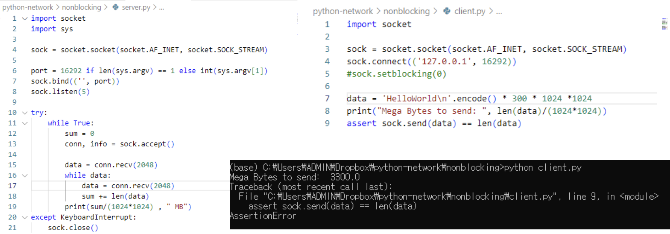 소켓 커널 버퍼 사이즈로 인해 발생할 수 있는 오류를 보여준 예제이다.