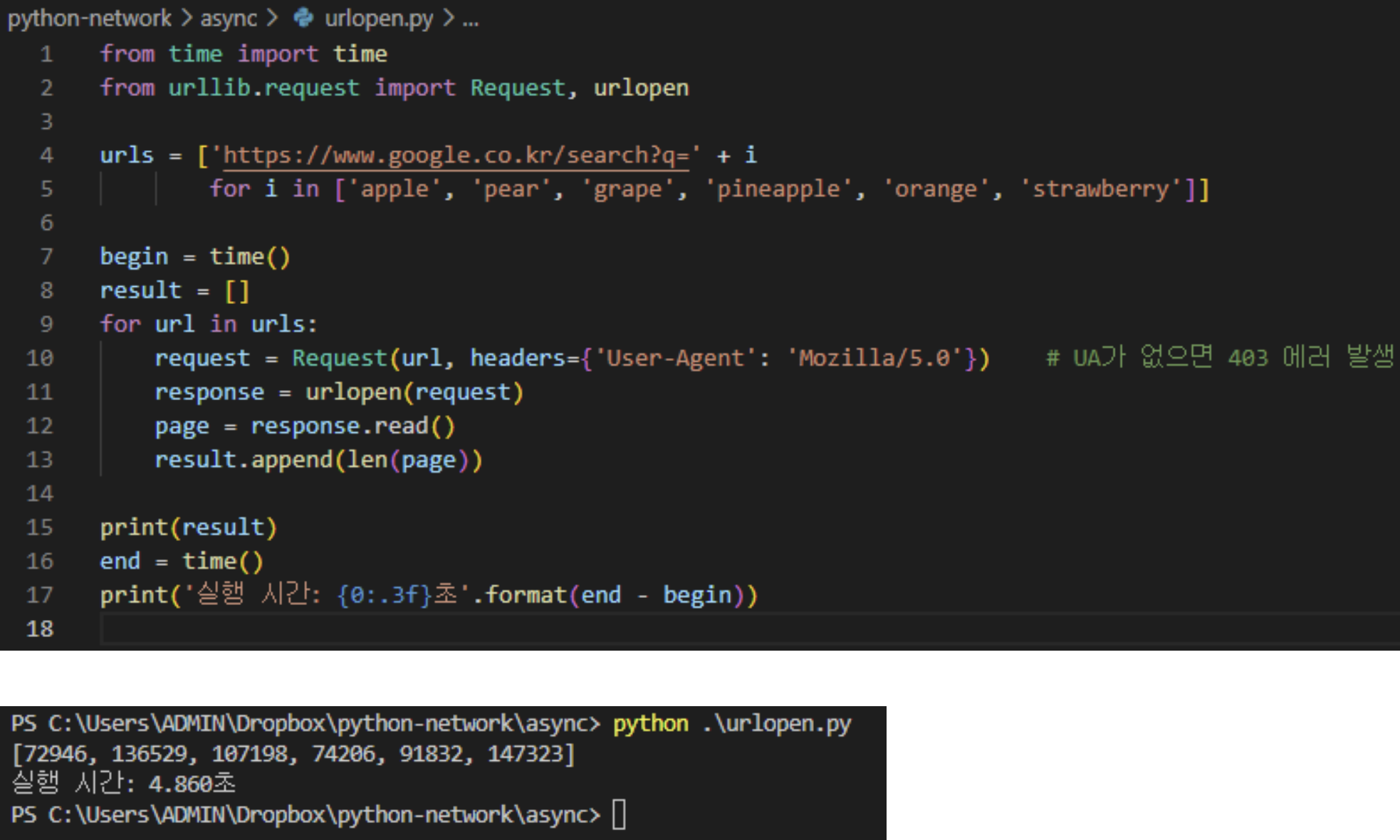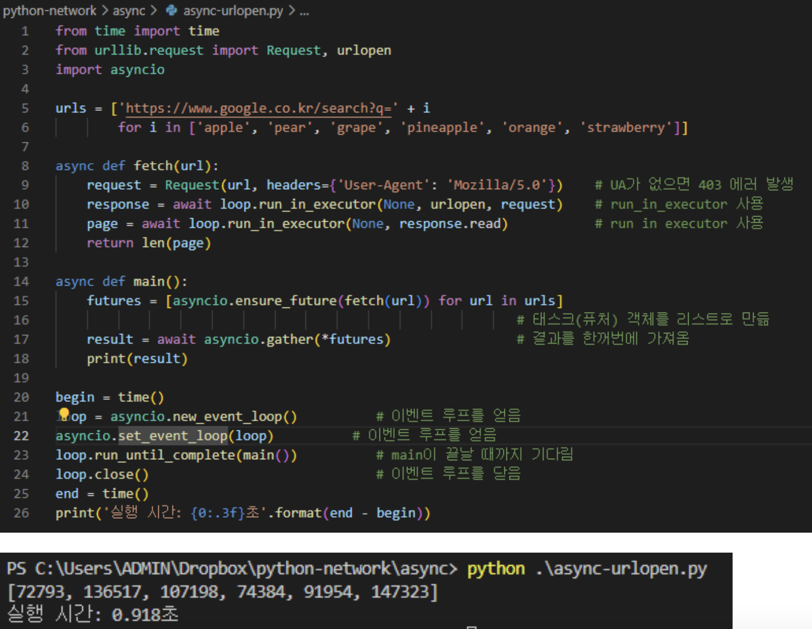 위의 코드는 앞서 이야기 한 asyncio 모듈을 통해 비동기로 웹 서치를 시행한 결과라고 할 수 있다.
