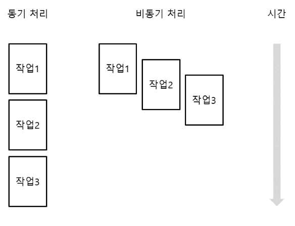아래 그림을 통해 순차적으로 동기화된 작업과, 비동기로 여러 개의 작업을 처리 하는 모습을 볼 수 있다.