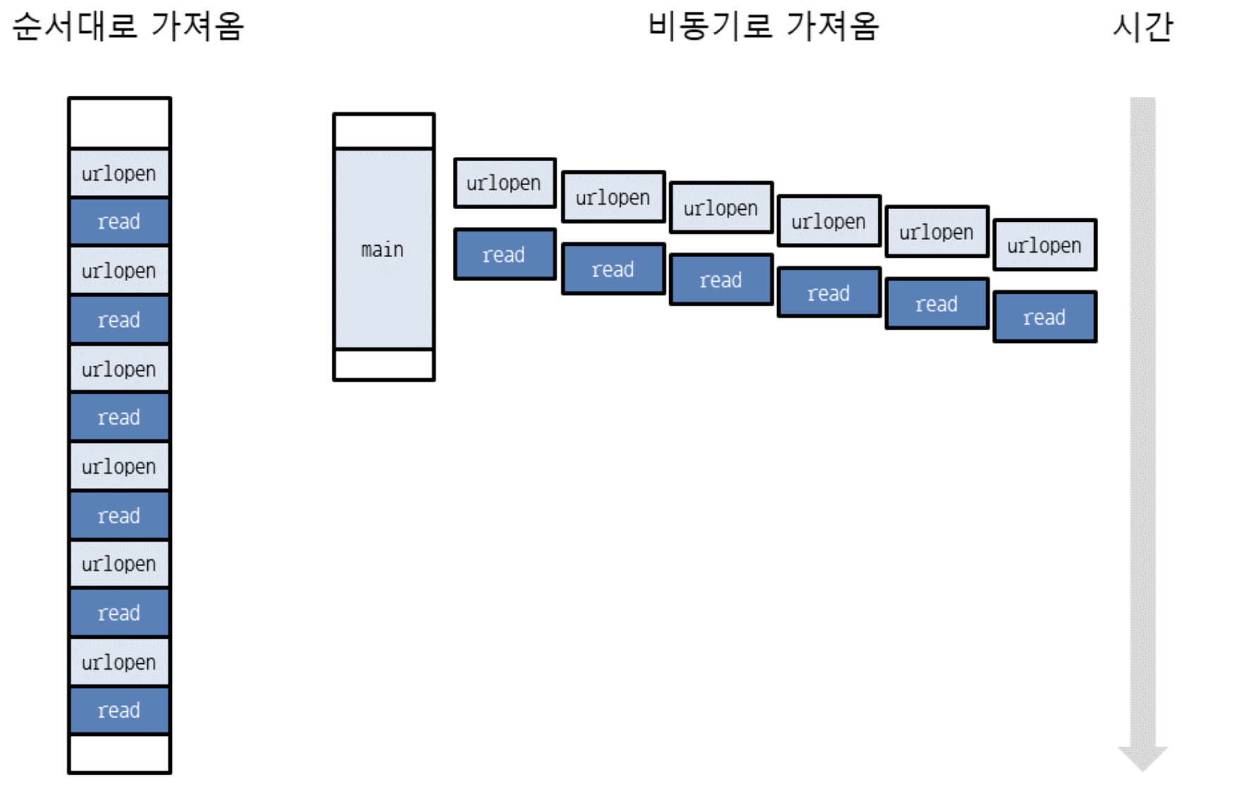 I/O가 길 때 하드디스크, DB, I/O 처리 시 순차적 처리보다 비동기화하는 게 더 속도 향상에 도움이 된다.