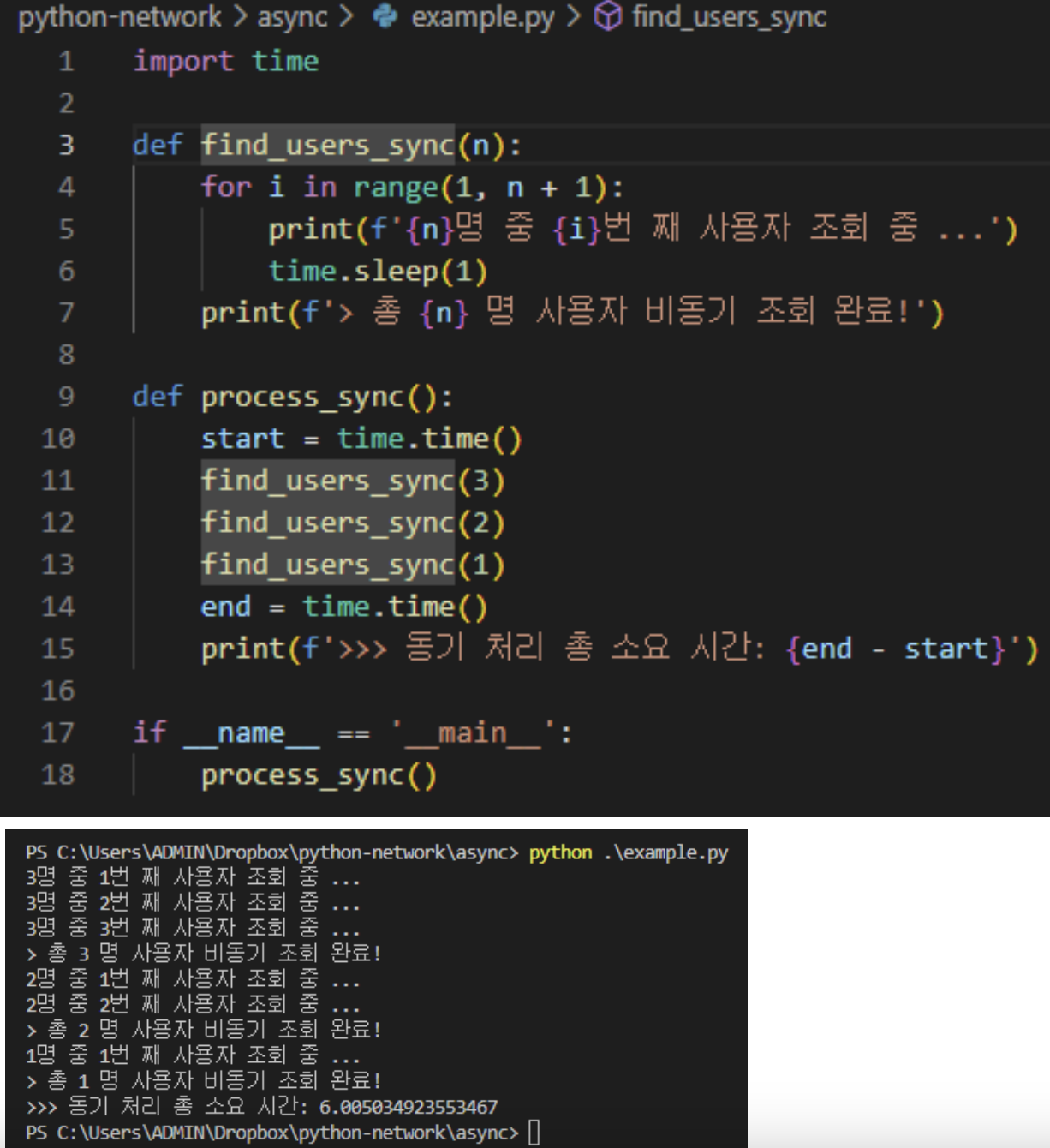 위 예제는 프로그램이 동기적으로 실행되는 모습을 보여주는 것이다.