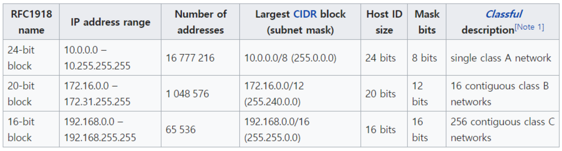Network Address Translator(NAT)가 이용하는 사설 IP 주소는 아래와 같다.