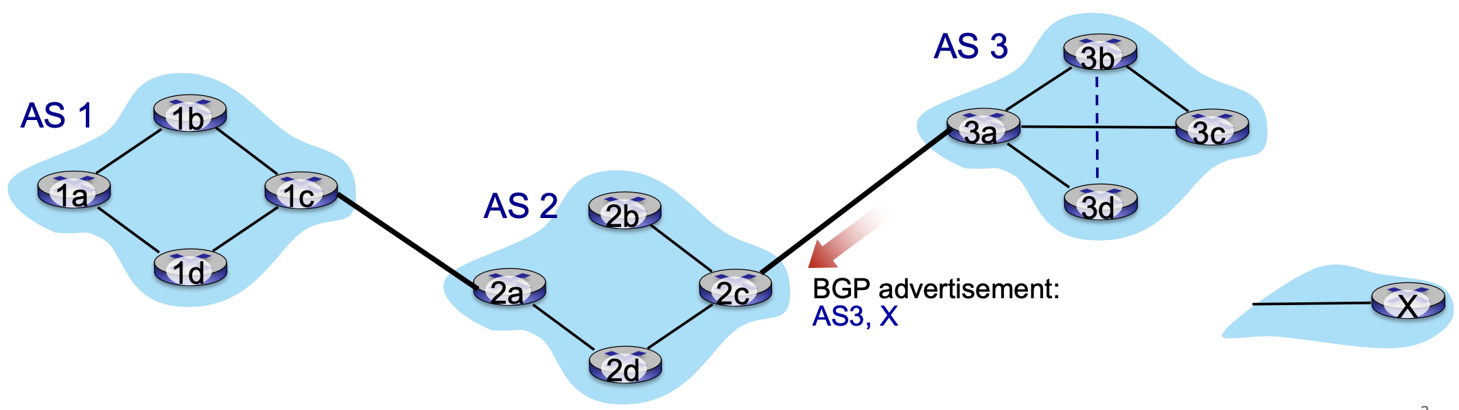 이때 eBGP인 3a가 AS 2의 2c에게 "AS3, X"라는 eBGP 메세지를 전송한다.