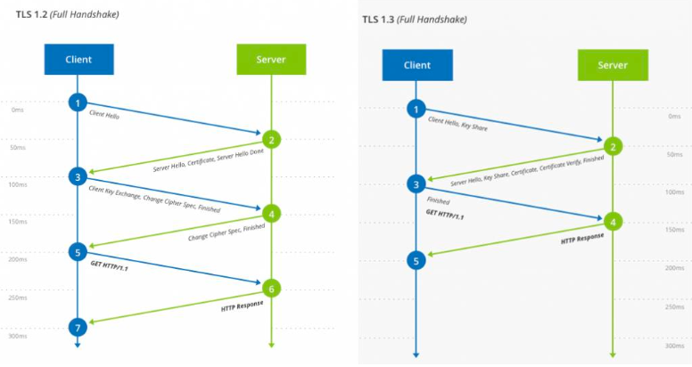 따라서 TLS 1.3은 TLS 1.2의 성능을 개선하여 위 사진과 같이 RTT의 개수를 줄여준다.