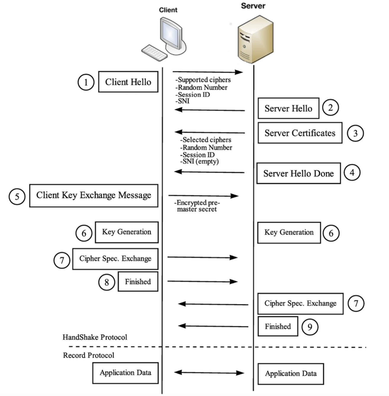 TLS에서는 프로토콜의 버전을 동의하고, 암호화 알고리즘을 선택하고 인증서를 교환 및 검증하는 과정과 암호키를 생성하는 작업이 수행된다.