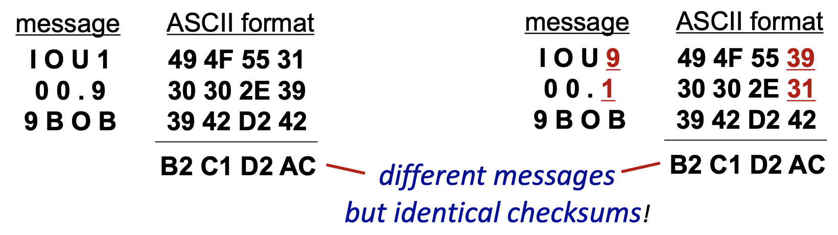 그런데, 체크섬은 오류 검출이 어렵고 동일한 해시값을 갖는 메세지의 개수가 많다.