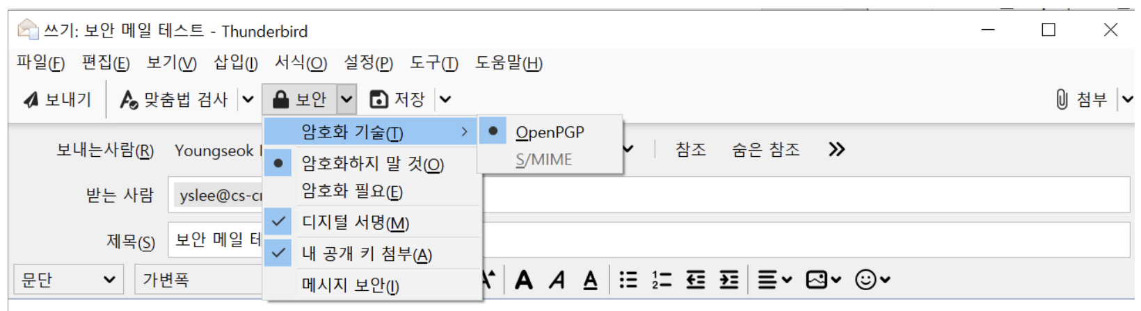 위 사진과 같이 Mozilla Thunderbird 메일 앱에서 암호화 기술을 확인하면 OpenPGP가 존재함을 알 수 있다.