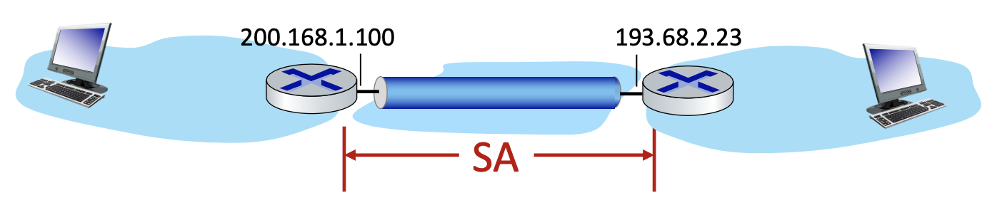 SA는 암호화 관련 여러 기능들을 결합한 것으로 데이터를 전송하기 전 호스트 또는 라우터 사이에서 Security Associations (SA)를 만든다.
