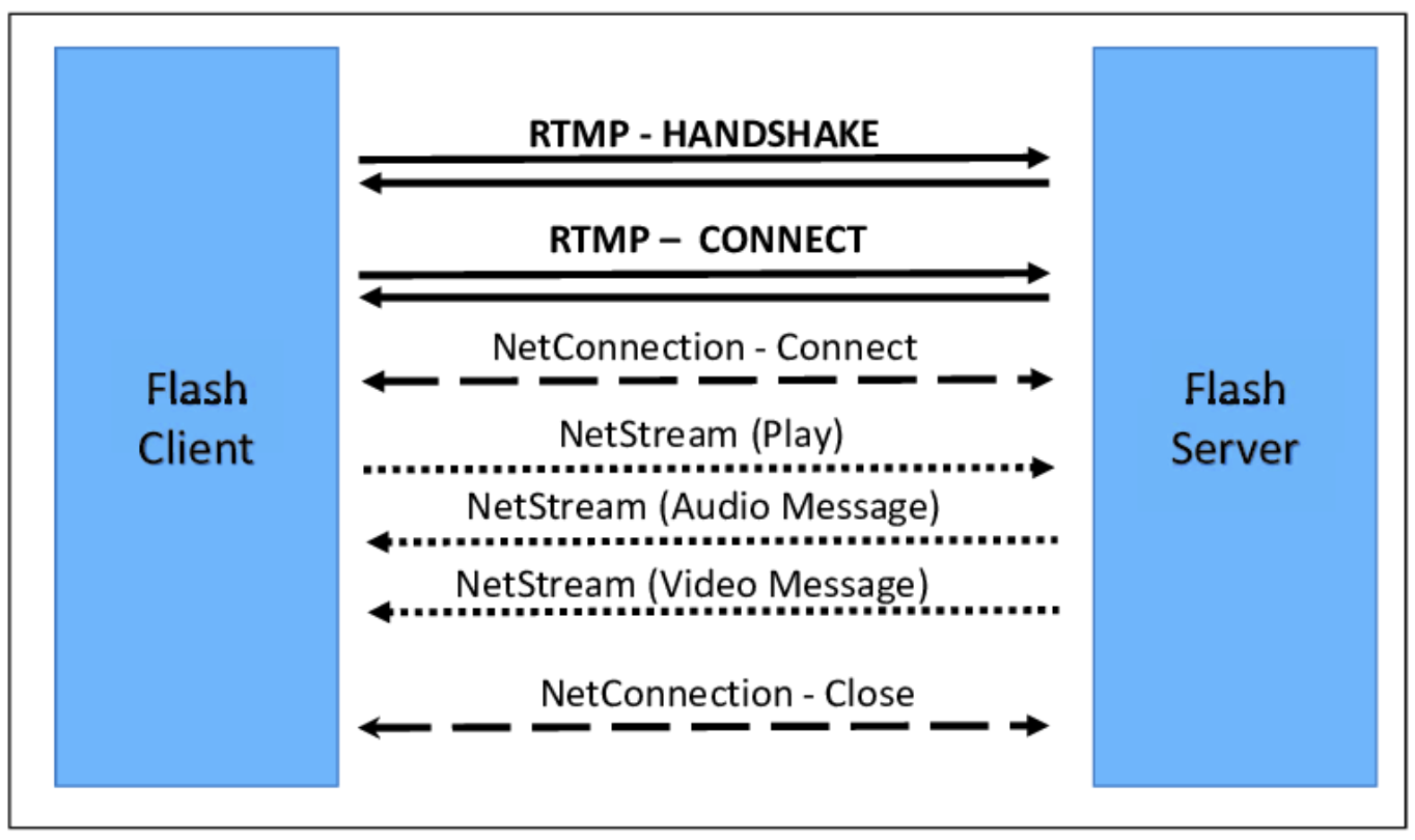 RTMP는 관련 제어하는 핸드쉐이크 제어 메세지가 있고, PLAY, 오디오, 비디오 등 데이터 자체를 재생하기도 한다. RTMP는 제어 메세지를 전달하는 프로토콜 메세지를 다 가지고 있으므로 RTMP 구현시 웹브라우저에서 오디오비디오 재생가능