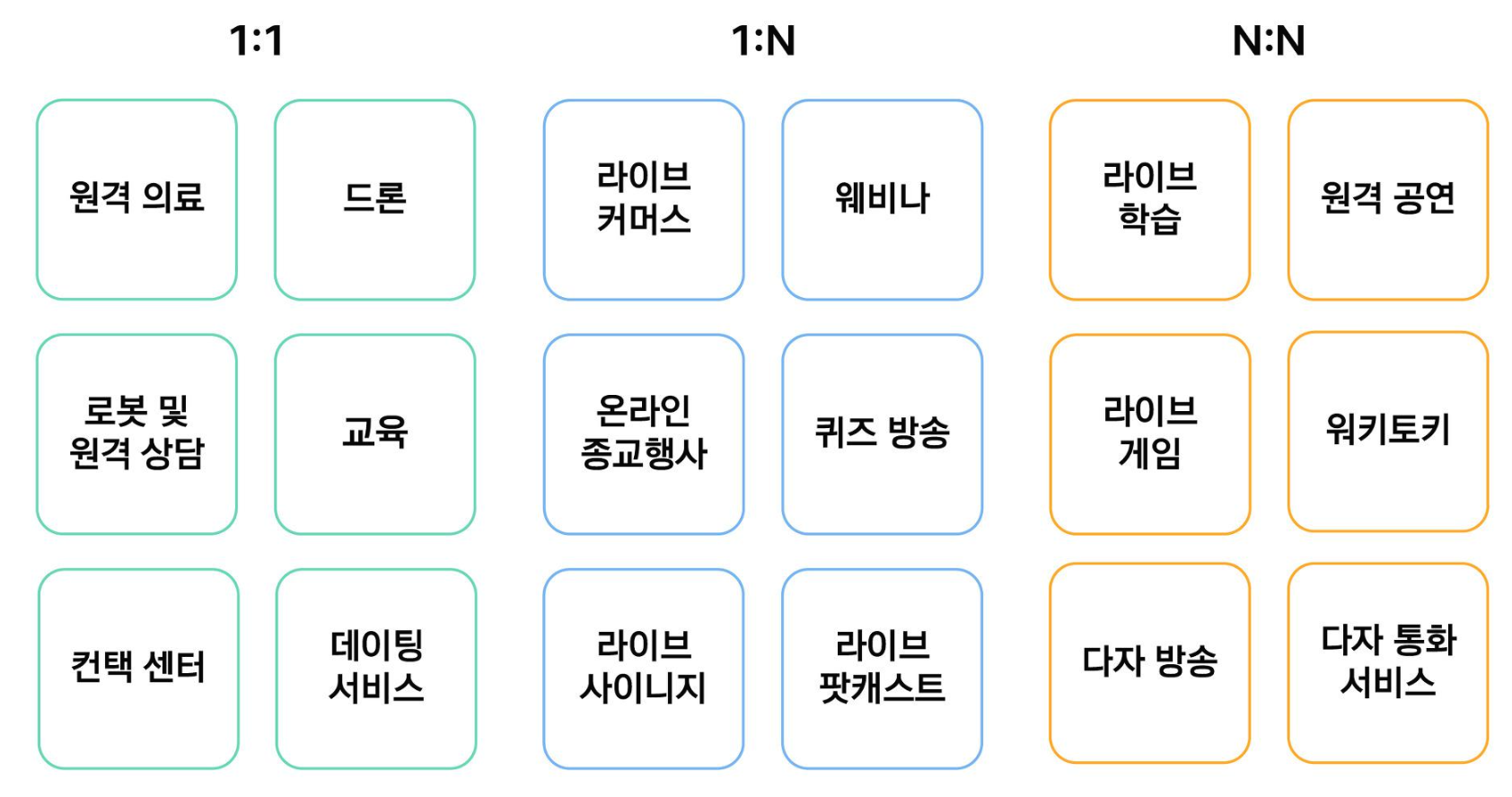 위 사진은 WebRTC로 가능한 언택트 서비스들로 실시간 상호 응답이 가능한 서비스이다.