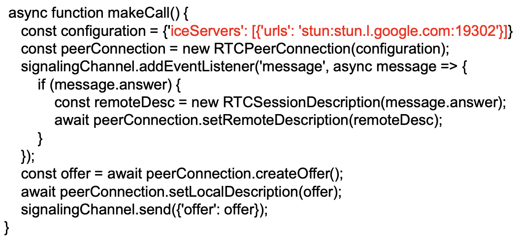 위와 같은 서버는 개발자가 만들 수 없고 공유기를 통과하는 TURN, STUN 서버가 있어야 사용할 수 있다. 이때 이 서버들은 별도의 통신사나 구글같은 컨텐츠 제공회사에서 별도로 만들어 제공해준다.