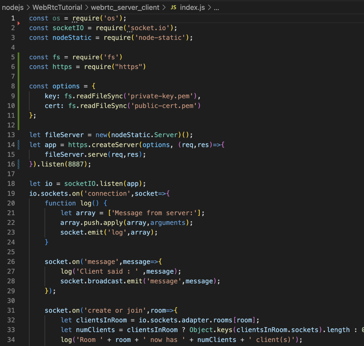 서버의 index.js 코드이다. socket.io와 https 라이브러리를 사용하고 있다.