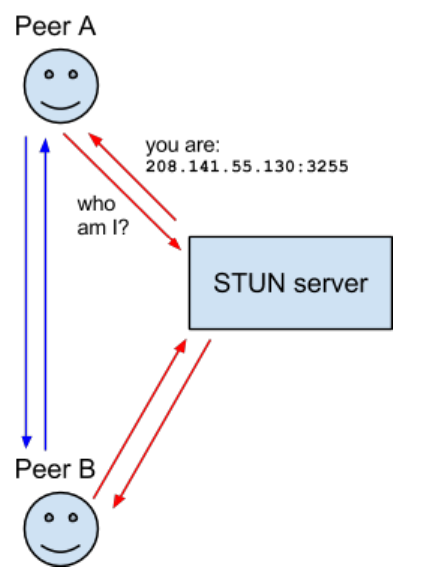 이때 공유기에 공인 ip와 매핑해주는 기술을 NAT라고 하는데, 매핑해주는 역할을 공유기에서 하기 때문에 개인 컴퓨터는 공인 ip 주소를 모른다. 하지만 피어 간의 연결을 생성하기 위해서는 자신의 공인 ip를 상대방에게 전달을 해야하는데, 이때 사용할 수 있는 프로토콜이 STUN이다.
