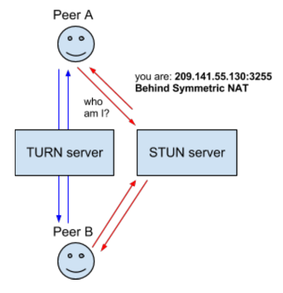 일부 라우터는 symmetric NAT라는 기술을 채용하여, 이전에 연결한 peer들만 연결을 허용한다. 이로 인해 peer간의 직접 연결이 불가능해지며, 릴레이 서버를 두어 symmetric NAT를 우회하는 방법을 TURN이라한다.