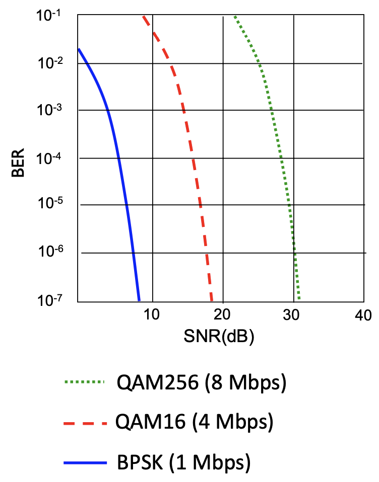 그래프를 보면 QAM256을 사용하다가 오류발생률이 높아지자 QAM16을 사용하여(= 속도를 낮춰) 오류발생률을 낮출 수 있다. 따라서 위의 그래프에서 우측에서 좌측으로 사용하면 변환 프로토콜을 점점 변화시킨다.
