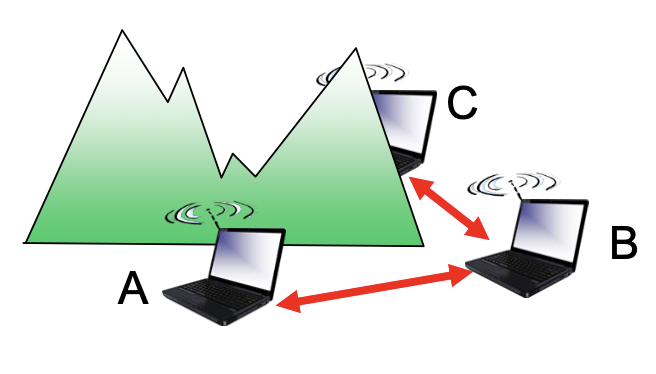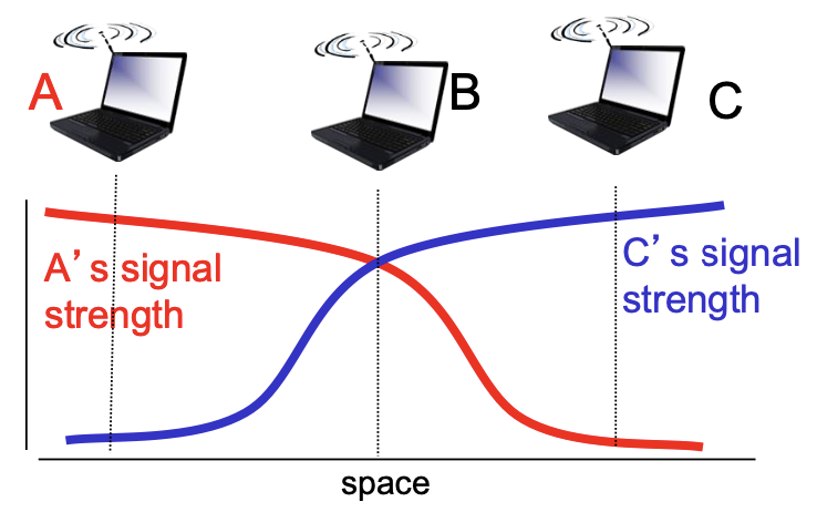 그런데 각 선이 무선으로 연결되어 있기 때문에 C는 A-B가 통신 중인지를 알 수 없다. 따라서 이러한 상황을 제어해야 충돌이 발생하지 않는다.