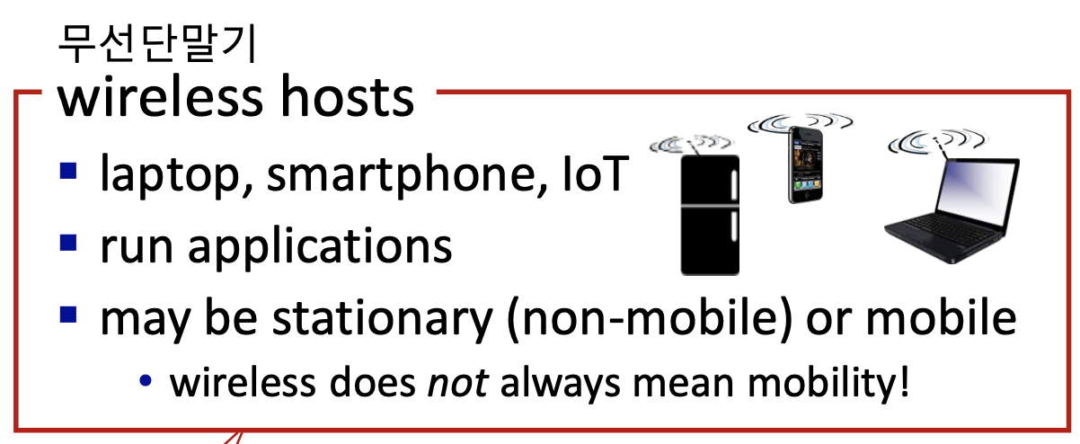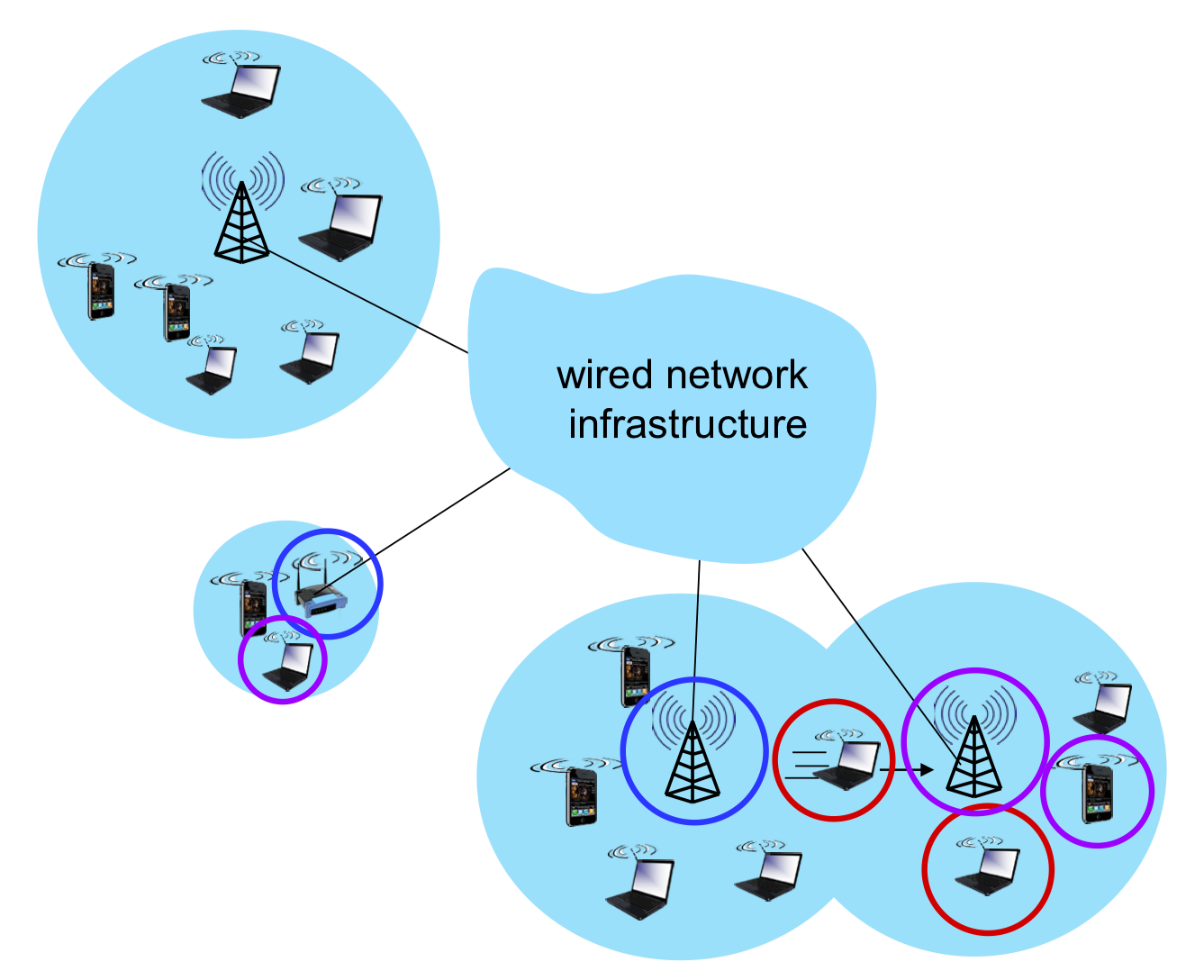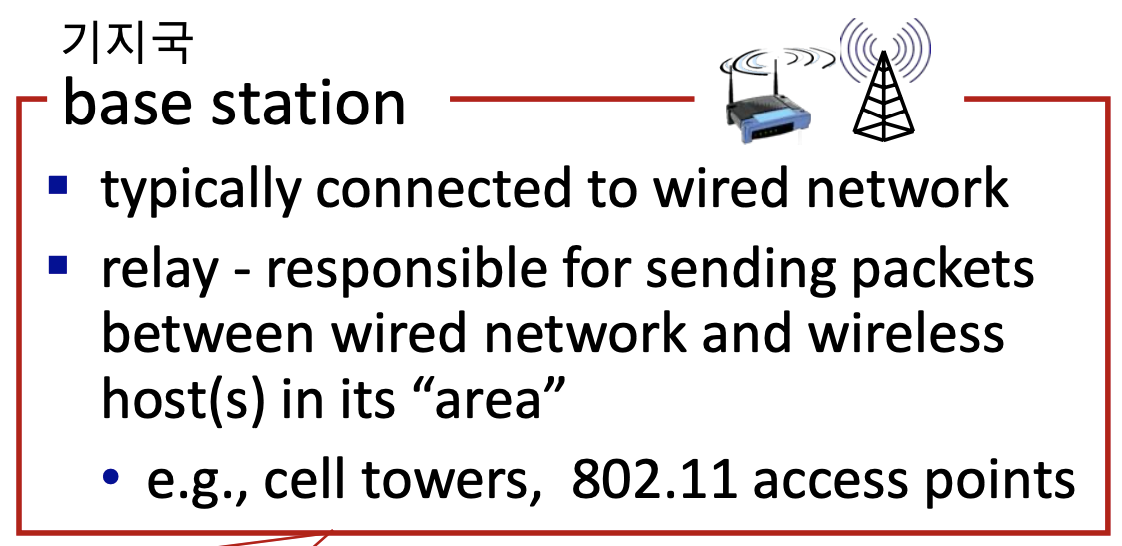 붉은색이 무선단말기(wireless hosts)이고, 파란색이 기지국(base station), 보라색이 wireless link를 말한다.