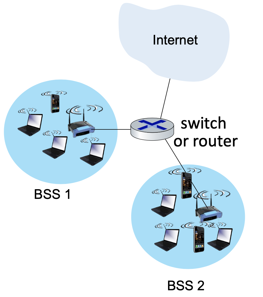 인프라 모드에서 wireless hosts, AP(base station), ad hoc mode를 모두 포함하는 기초적인 서비스 집합을 이야기하며 cell이라고도 한다. 이러한 BSS가 모여서 거대한 네트워크를 생성한다.