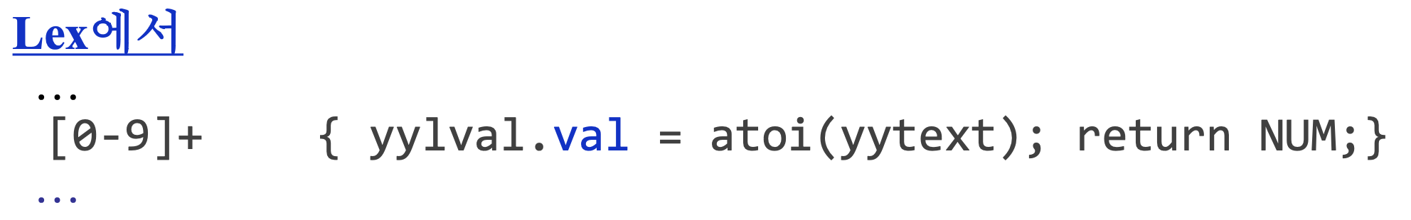 Lex에서는 위와 같이 yylval의 val로 나타낼 수 있다. yacc에서 구조체의 형식으로 값을 val이라고 표기했다면, lex에서도 해당 이름을 맞춰 주는 것이 좋다.
