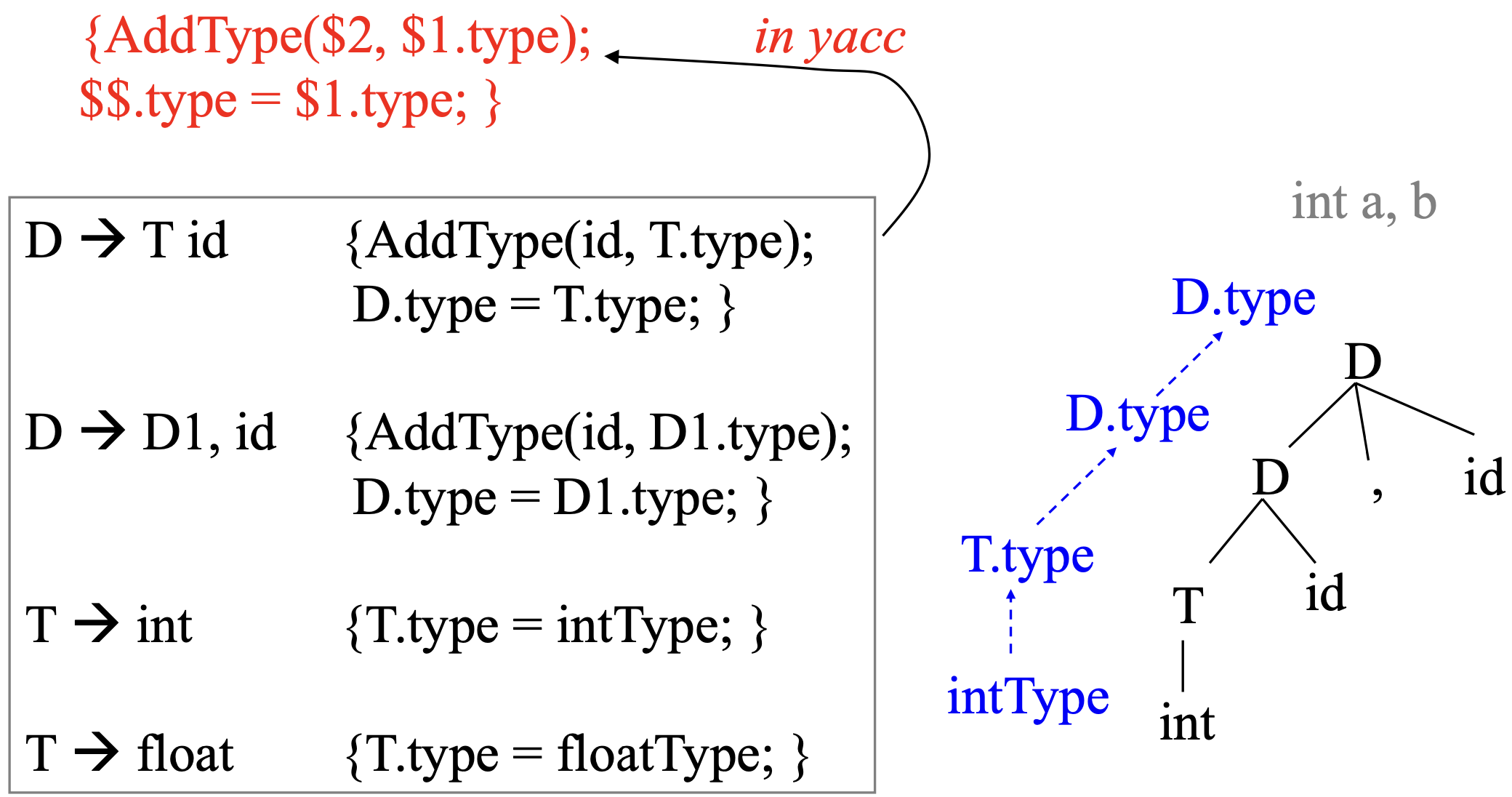 이후 D -> T id인 경우 id에 Type을 추가해주고, D 즉 $$에 T의 타입을 넣어준다. 이렇게 하는 이유는 바로 아래의 D -> D1, id 부분 때문인데, 콤마(,)를 통해서 변수를 여러 개 선언을 할 때 콤마(,) 앞의 변수와 동일한 타입을 갖게 하기 위함이다.