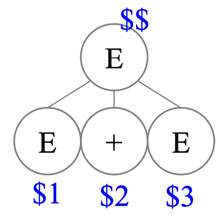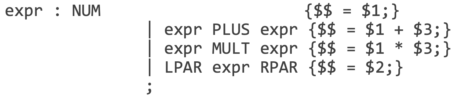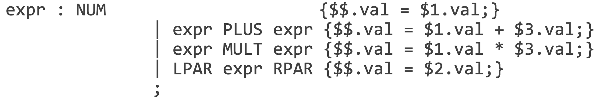- ex) expr: expr PLUS expr { $$ = $1 + $3; }