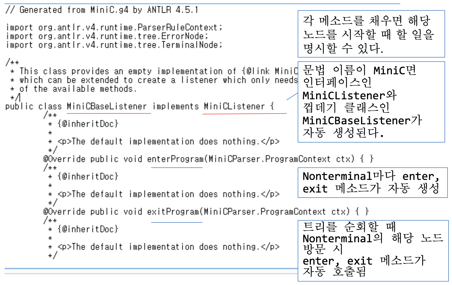 트리를 방문할 때에는 enterProgram, 떠날 때에는 exitProgram과 같이 ANTLR에서 각 메소드를 제공해준다. 따라서 노드의 방문과 종료 시점에 할 action을 각 메소드의 안에 명시해주면 되는 것이다.