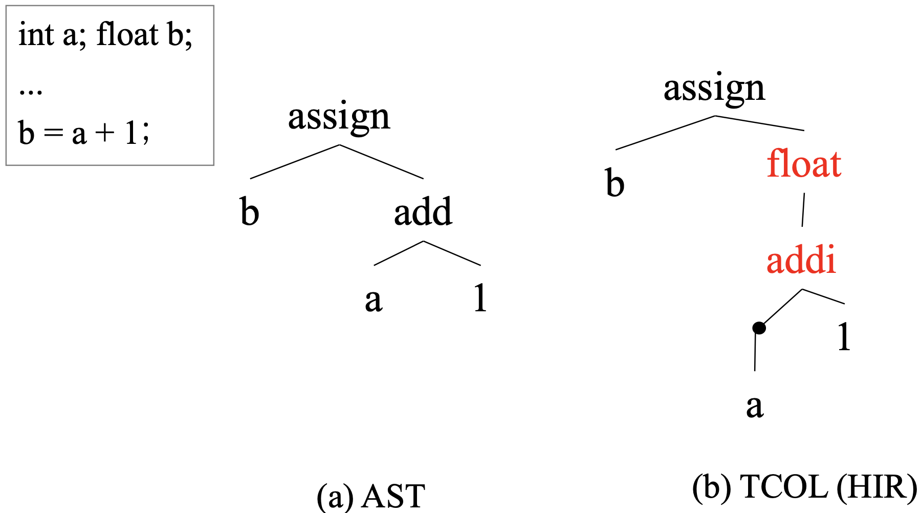 AST에서 sementic적인 분석이 덧붙여져 float 의미 분석 후 float라는 정보가 들어가면서 전체적인 AST의 구조가 구제적으로 a+1이 int의 합으로 계산되고, 이후 float로 변환이 되는 절차적 성격의 새로운 node가 추가된다.