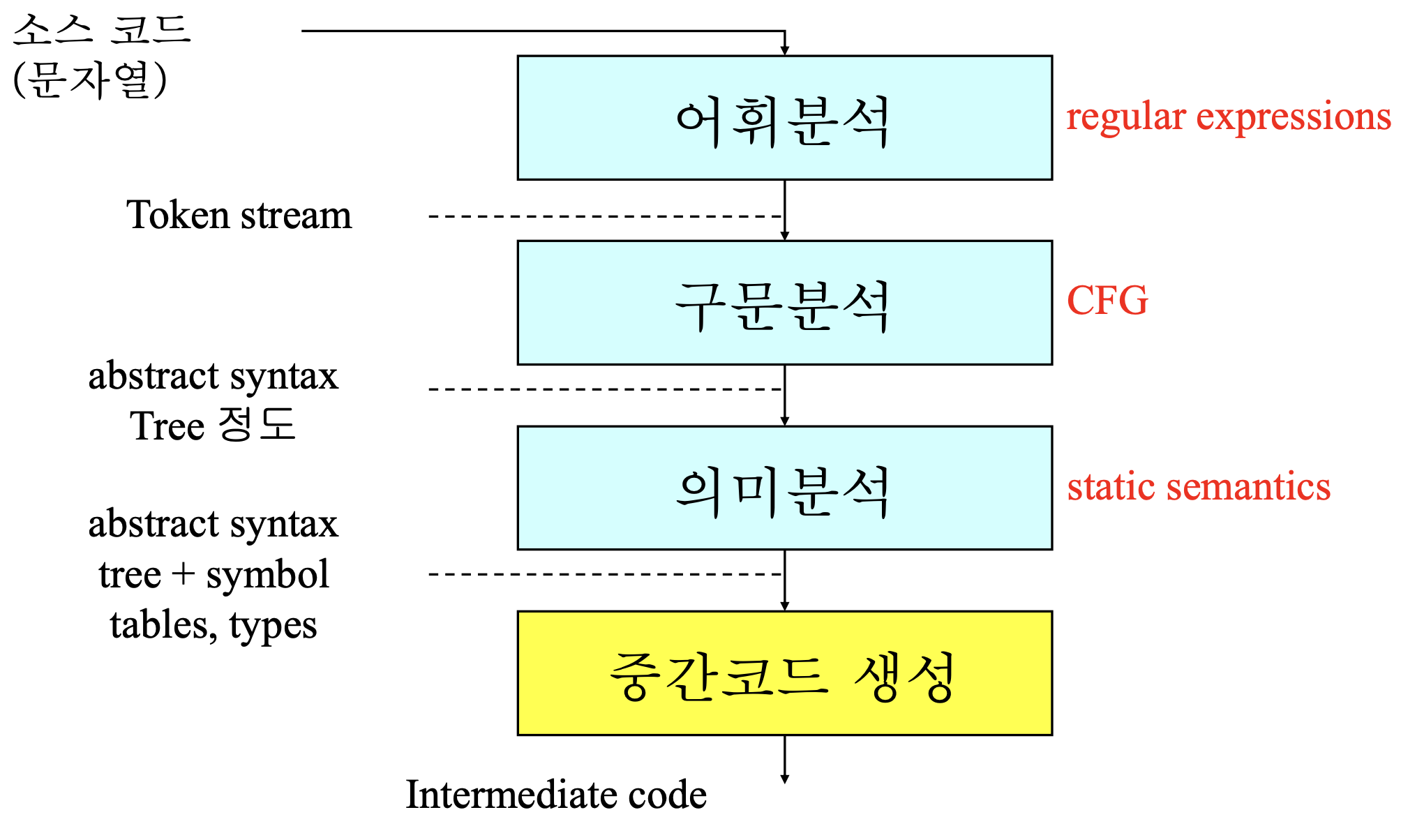 전체적인 컴파일 과정은 High-level 언어에서 Low-level 언어로 만들어주는 과정인데, 이 과정에서 High-level 언어보다는 low하고, Low-level 언어보다 high한 언어로 만들어주는 단계를 거치게 된다.