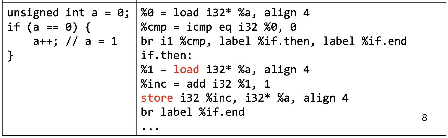 GCC GIMPLE은 c코드와 유사하고, LLVM IR에서는 변수를 나타내기 위해 @와 %를 사용한다. load, store와 같은 키워드로 인해 가독성이 나빠지지만, Low-level 관점으로 보면, 명시적으로 메모리 연산을 알려주기 때문에 기계 언어로 번역하기에 더 용이하다.