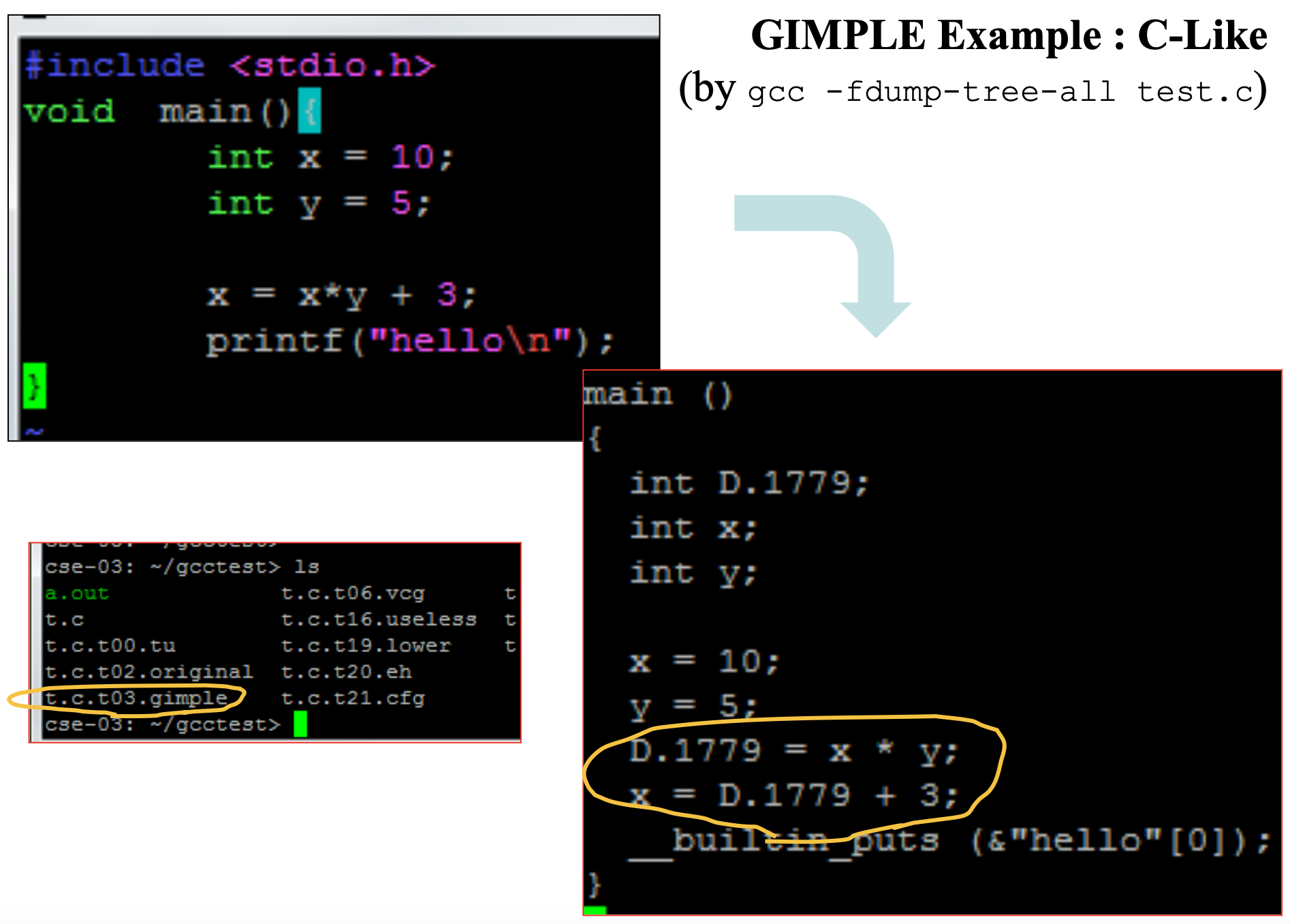 대표적인 3-address code로 gimple을 열어보면 D.1954와 같은 변수를 발견할 수 있는데, 이 변수가 바로 임시변수이다.