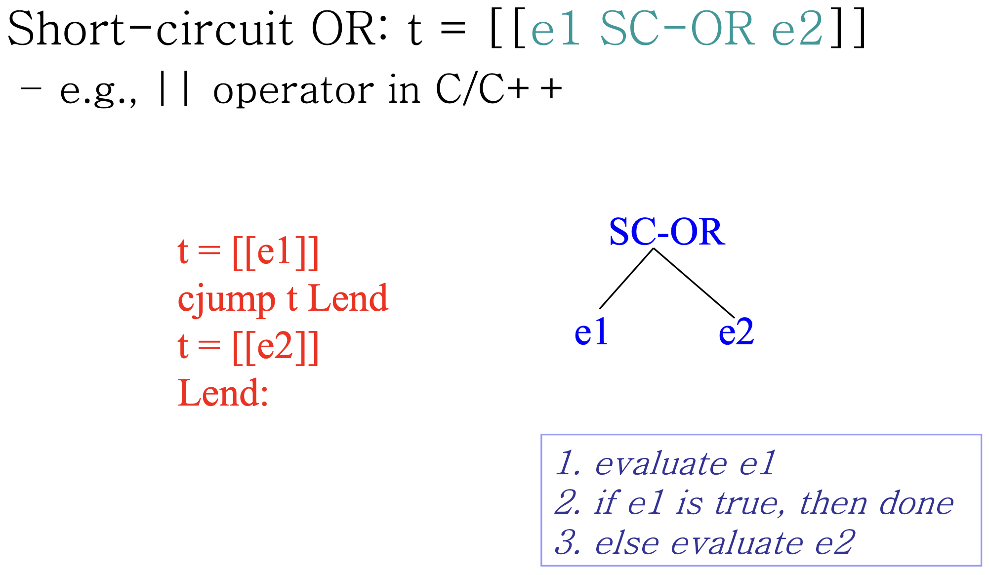 따라서 [[e1]]의 값을 t에 넣는데, cjump를 통해 t의 값이 참이라면 Lend로 점프한다.
