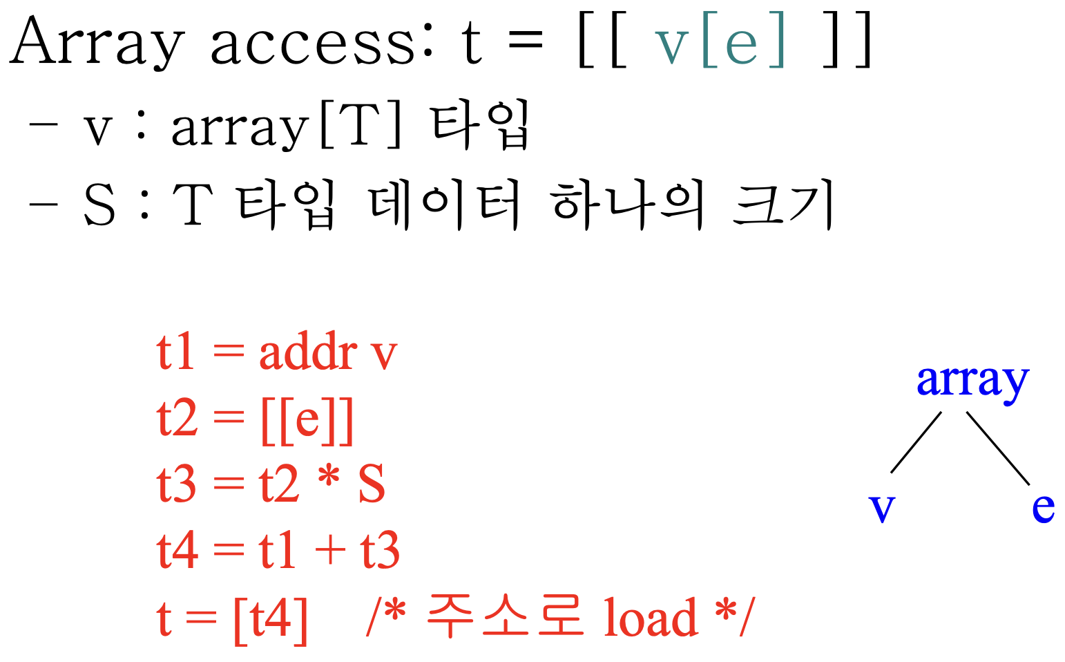 또한 c에서 &a[0]의 값은 a와 동일하지만, 다른 언어에서는 array의 주소가 c와 같지 않으므로 3-addr code에서는 배열의 시작 주소를 로드할 때 addr v를 사용한다.