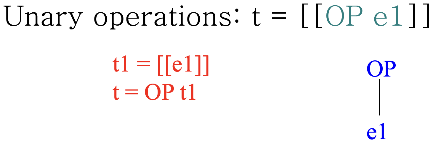 unary 오퍼레이터는 e1에 [[]]을 취한 결과값을 t1에 넣고, e1 앞에 OP를 붙여준다.