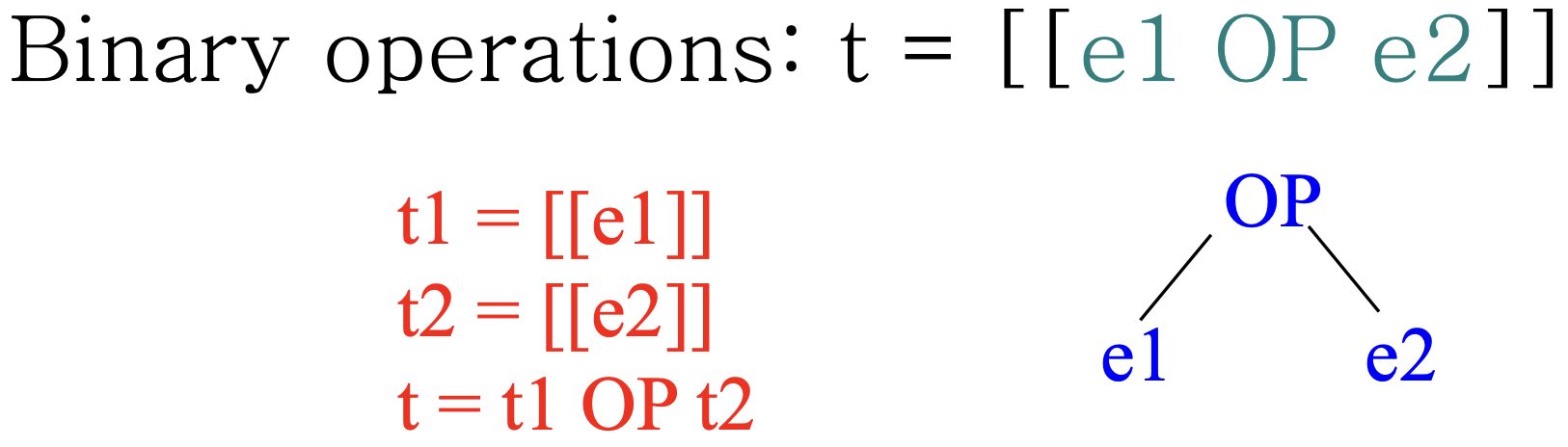 unary 오퍼레이터는 e1에 [[]]을 취한 결과값을 t1에 넣고, e1 앞에 OP를 붙여준다.