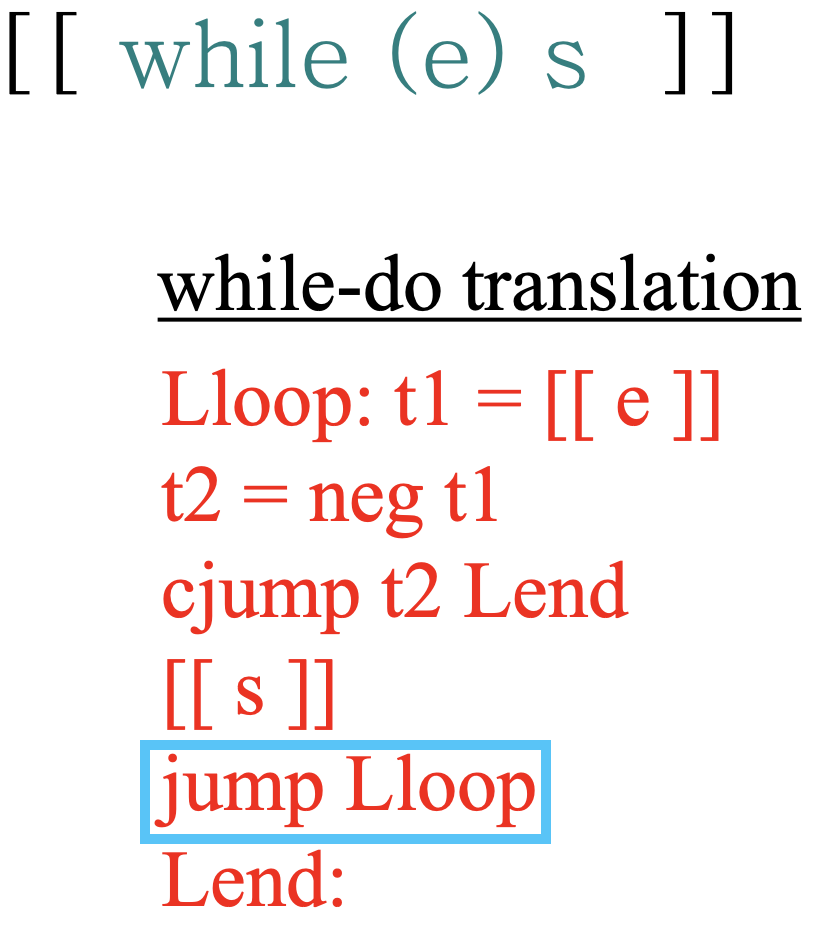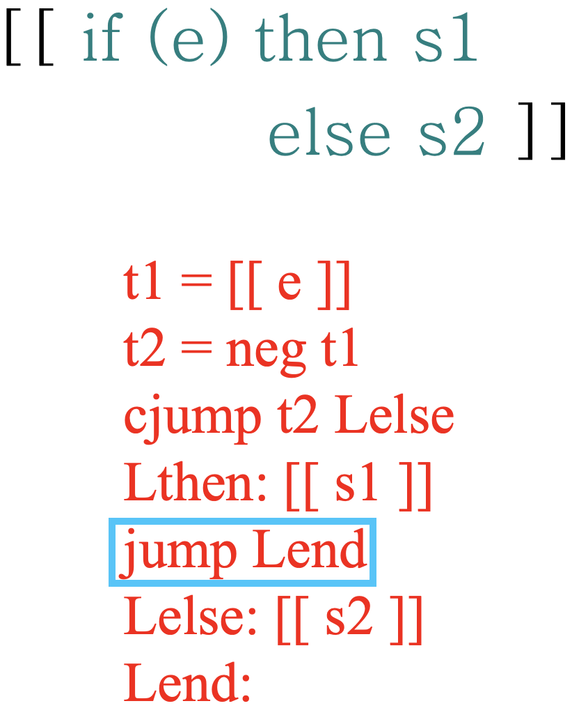 이때 주의해야 할 점으로는 [[ e ]]가 참인 경우 s1을 실행한 후 s2를 실행하게 되므로 s1의 계산이 종료되면 바로 Lend로 분기할 수 있도록 jump문을 넣어줘야 한다.