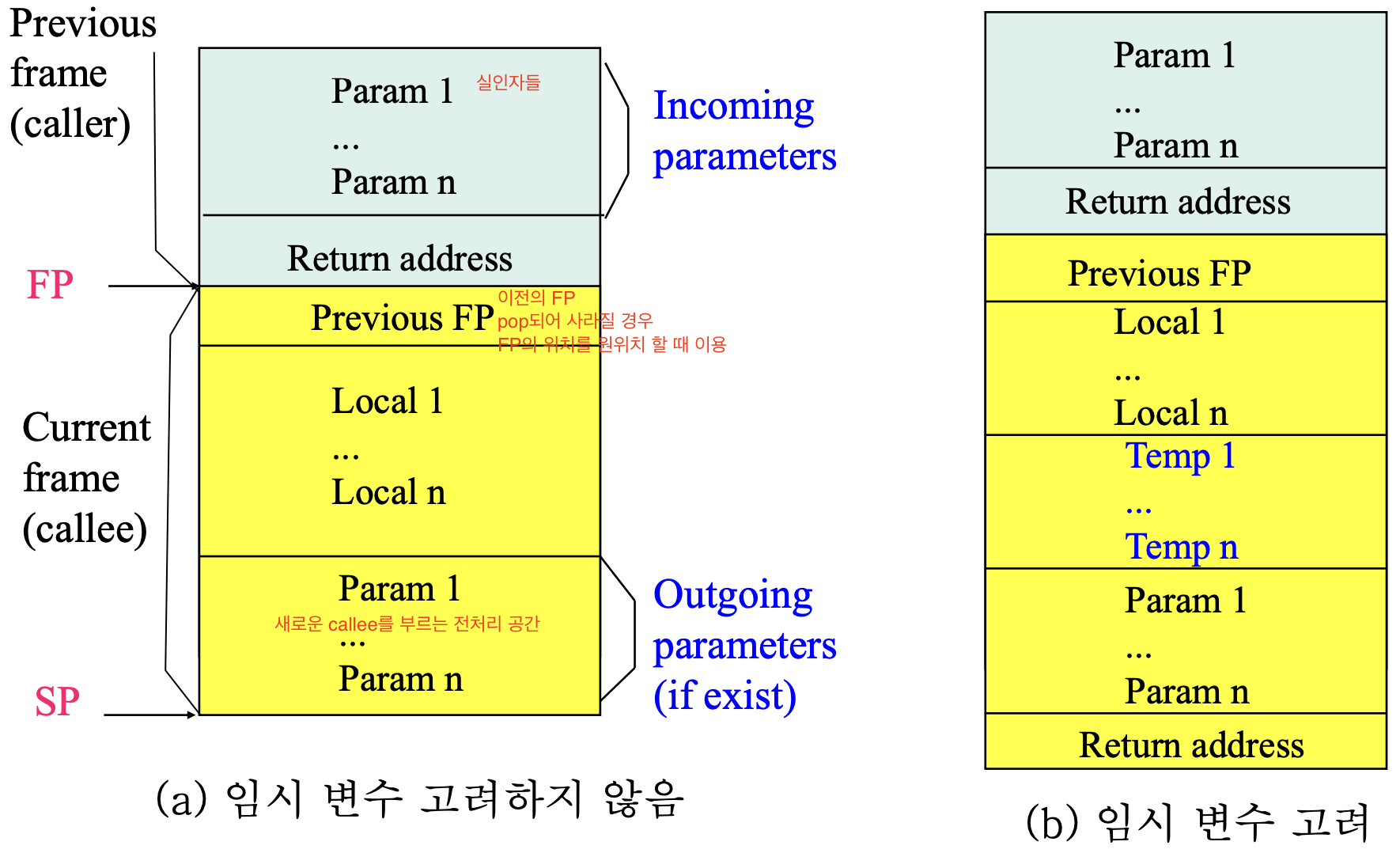 그러나 임시변수의 생성과 free가 많아 SP는 가변적이기 때문에 보통은 FP를 기준으로 접근한다.